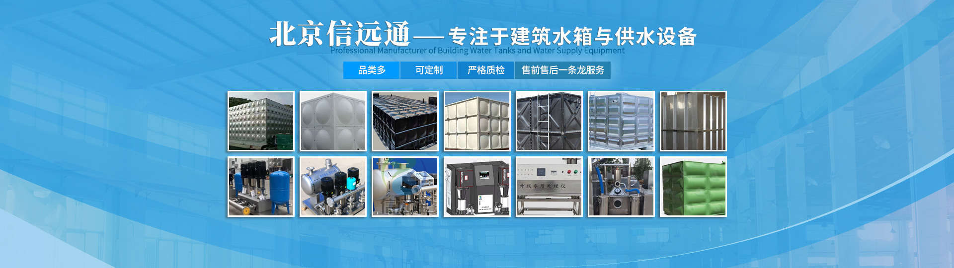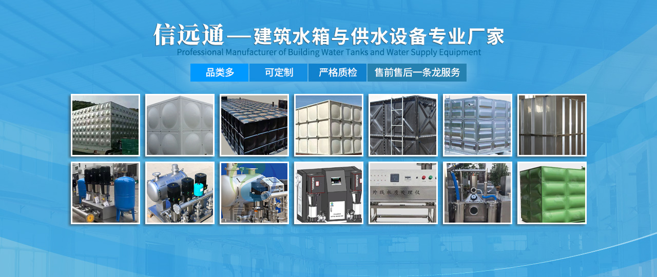 北京信遠通環保工程有限責任公司(北京信遠通)成立于2009 年,專注于不銹鋼水箱等建筑水箱和水處理設備,公司積極倡導綠色健康理念,重質量,守誠信,多年來為數百家客戶提供了產品與服務。十余年勵精圖治,北京信遠通始終堅守“以客戶為本,以質量為魂,以效率為先”的理念,是目前水箱與水處理設備行業中較具規模的企業之一?!?環保.節能.安全.智能 ——品牌理念:公司以“環保、節能、安全、智能”為品牌理念,通過不斷推動產品創新、營銷創新和管理創新,努力為客戶提供優質產品與服務。主要產品:信遠通主要產品包括:不銹鋼水箱、玻璃鋼水箱、搪瓷鋼板水箱、消防水箱、保溫水箱、BDF水箱、鍍鋅鋼板水箱;變頻供水設備、無負壓供水設備、消防增壓設備、紫外線消毒設備、水箱自潔消毒器;油水分離器、污水